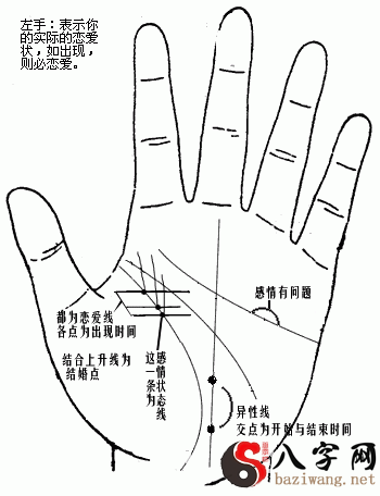 爱情线:自小指旁边开始为男(二十岁),女(18岁),小拇指正中间的爱情线为女(23)男(25),别的类推。