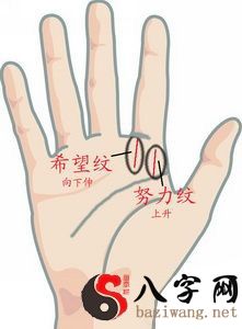 核心要点上往上走的纹(下面的图中深蓝色斜线所显示),表明勤奋会出现成效;若在核心要点起始点往无名指下升叫“期待纹”。有期待纹的人,梦越大运势越好。
